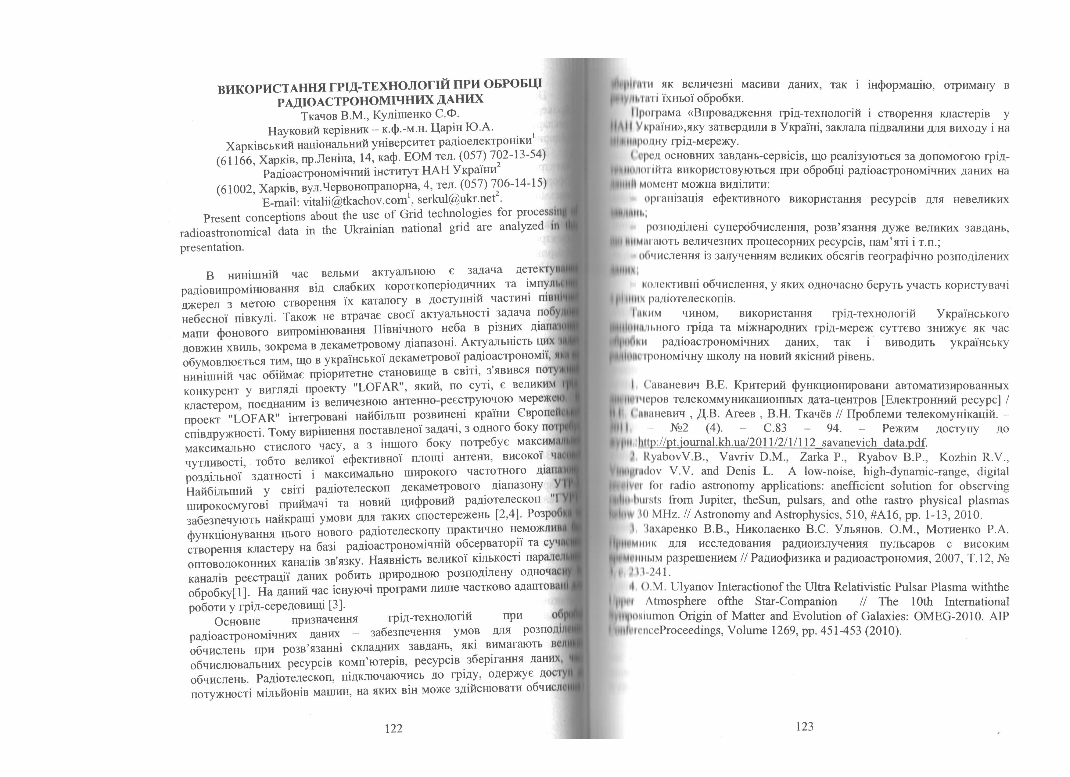 Ткачов В.М. Використання ГРІД-технологій при обробці радіоастрономічних даних / Ткачов В.М., Кулішенко С.Ф. // 16-й Международный молодежный форум «Радиоэлектроника и молодежь в ХХІ веке», 17-19 апреля 2012 г.: Сб. материалов форума. Т.6. Международная конференция "Информационные интеллектуальные системы" – Харьков: ХНУРЭ, 2012. – С.122-123.