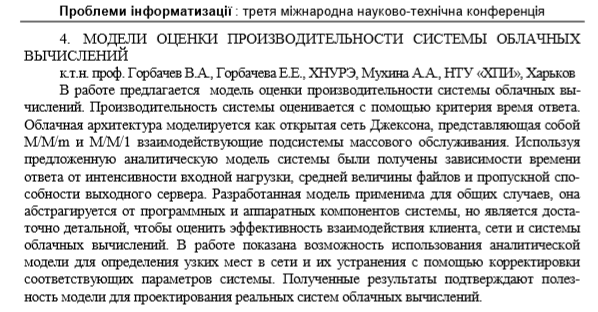 Горбачов В.О. Модели оценки производительности системы облачных вычислений / В.О. Горбачова, О.Є. Горбачова, А.А. Мухіна // Матеріали третьої міжнародної науково-технічної конференції «Проблеми інформатизації». - 2015. - 19 с.