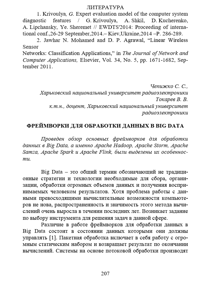 Токарев В.В. Фреймворки для обработки данных в BIG DATA / В.В. Токарев, С.С. Чепижко // Комп’ютерні інтелектуальні cистеми та мережі: матеріали XІ Всеукраїнської науково-практичної конференції аспірантів, студентів та молодих вчених «КІСМ-2018», 21-23 березня 2018 р. - Кривий Ріг, Україна. - С. 207- 208.