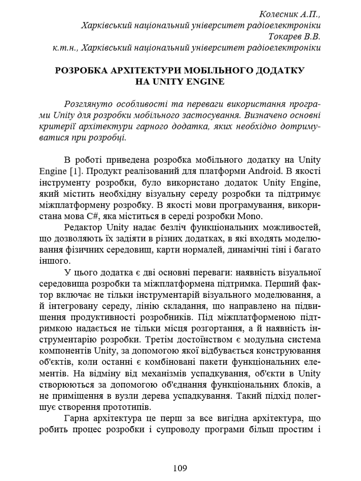 Токарев В.В. Розробка архітектури мобільного додатку на UNITY ENGINE / В.В. Токарев, А.П. Колесник // Комп’ютерні інтелектуальні cистеми та мережі: матеріали XІ Всеукраїнської науково-практичної конференції аспірантів, студентів та молодих вчених «КІСМ-2018», 21-23 березня 2018 р. - Кривий Ріг, Україна. - С. 109 - 110.