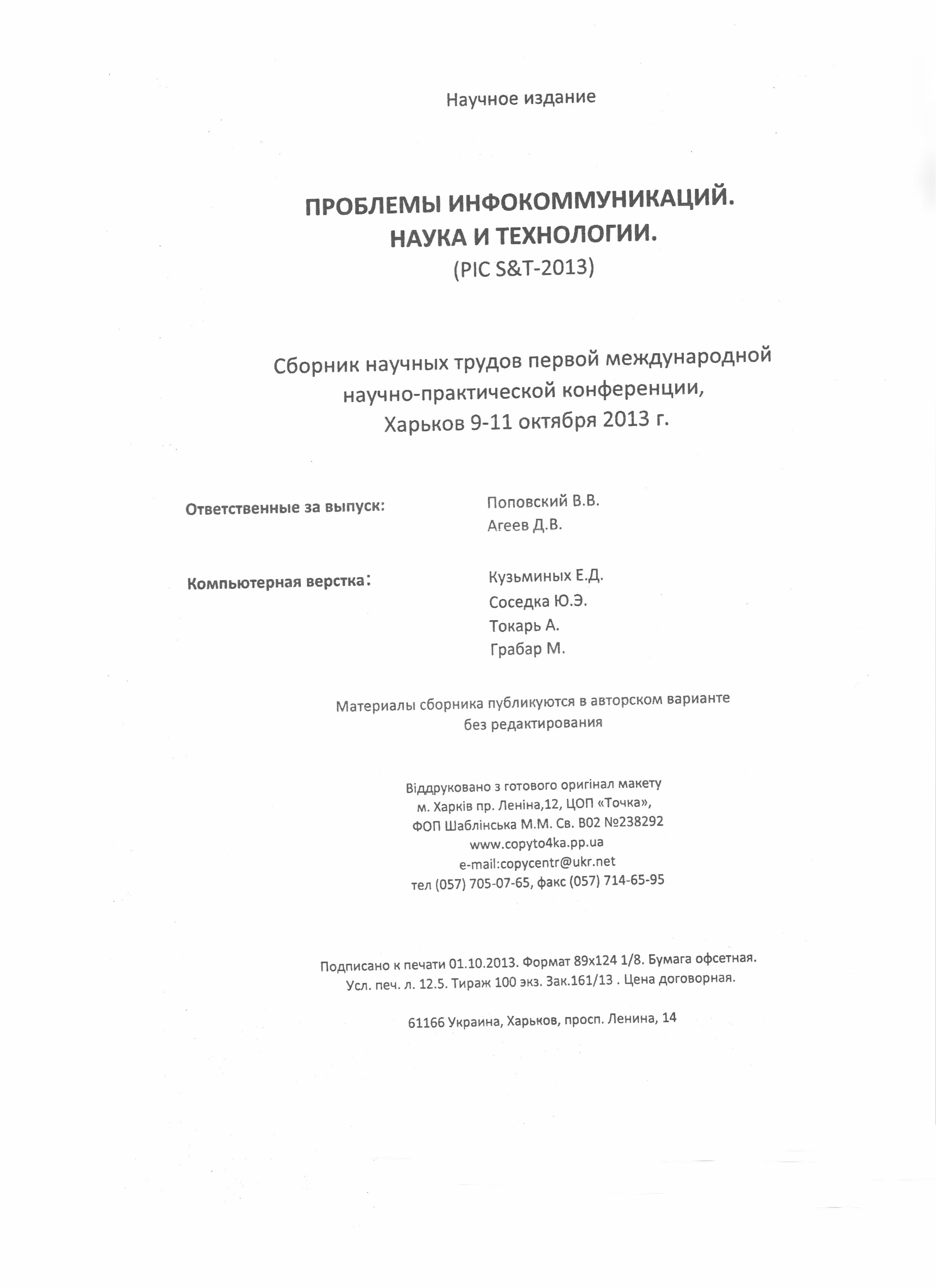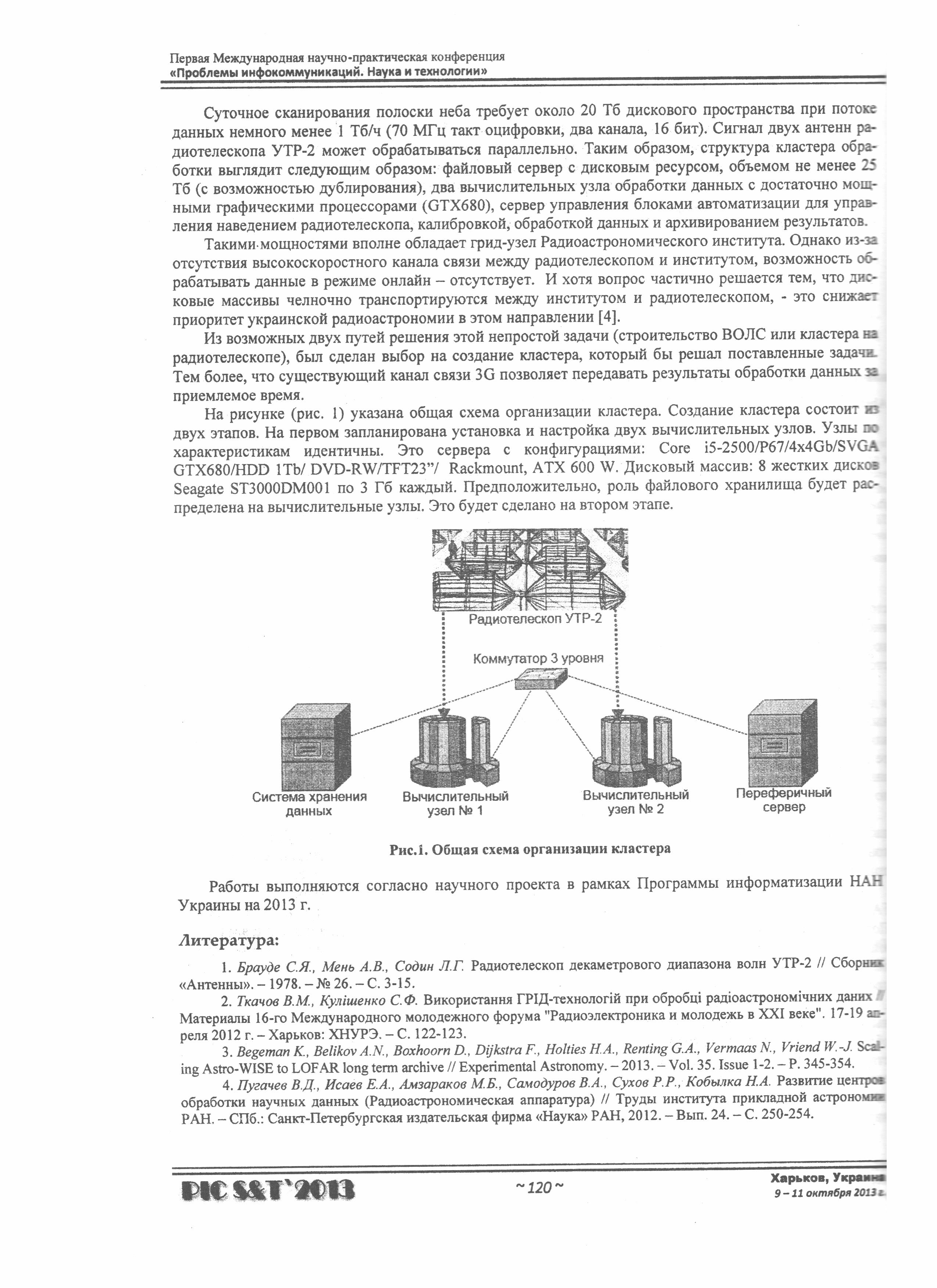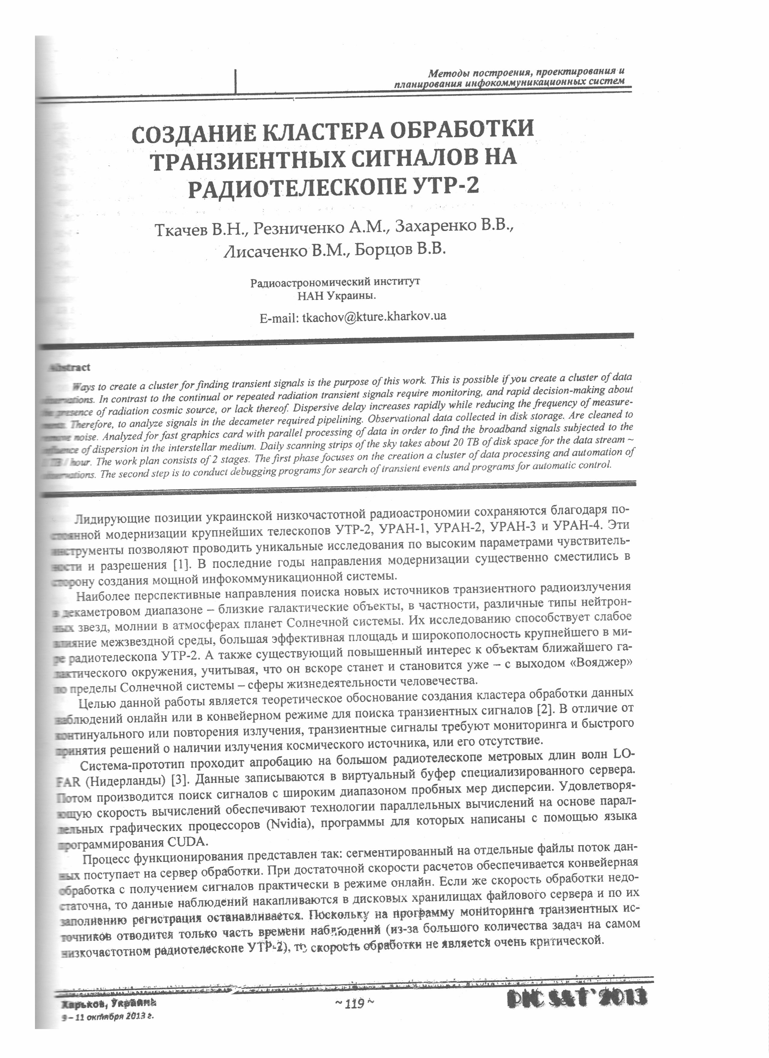 Ткачев В.Н. Создание кластера обработки транзиентных сигналов на радиотелескопе УТР-2 / В.Н. Ткачев, А.М. Резниченко, В.В. Захаренко, В.М. Лисаченко, В.В. Борцов // I Международная научно-практическая конференция «Проблемы инфокоммуникаций. Наука и технологии» (PICS&T-2013). Секция "Методы построения, проектирования и планирования инфокоммуникационных систем". - Харьков, ХНУРЭ. - 9-11 октября 2013 г. - С. 119-121.