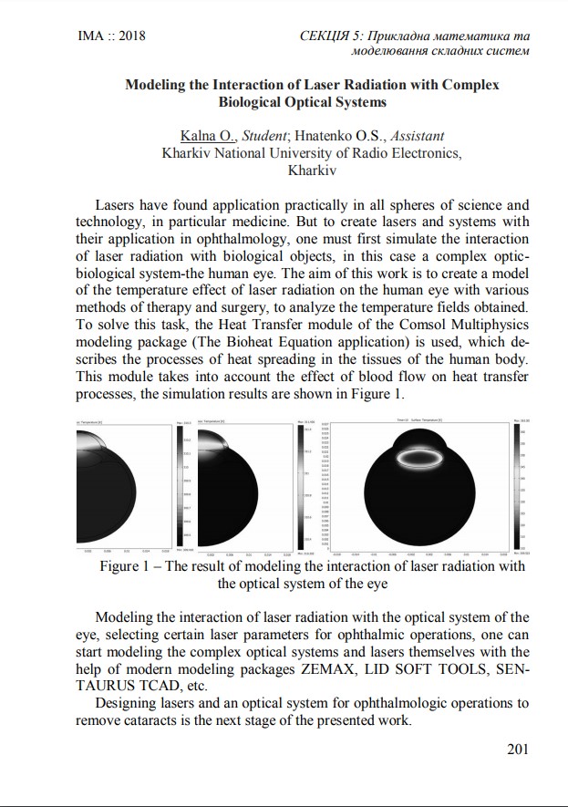 Hnatenko O. S. Modeling the interaction of laser radiation with complex biological optical systems / O. S. Hnatenko, O. O. Kalna // Інформатика, математика, автоматика: матеріали науково-технічної конференції ІМА:2018, 5-9 лютого 2018 р. - Суми, 2018 - 201 c.