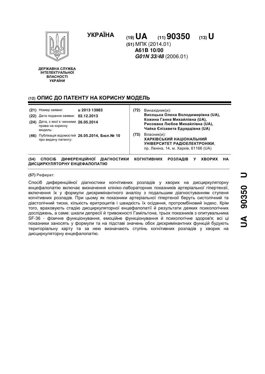 Публікація: Спосіб диференційної діагностики когнітивних розладів у хворих на дисциркуляторну енцефалопатію