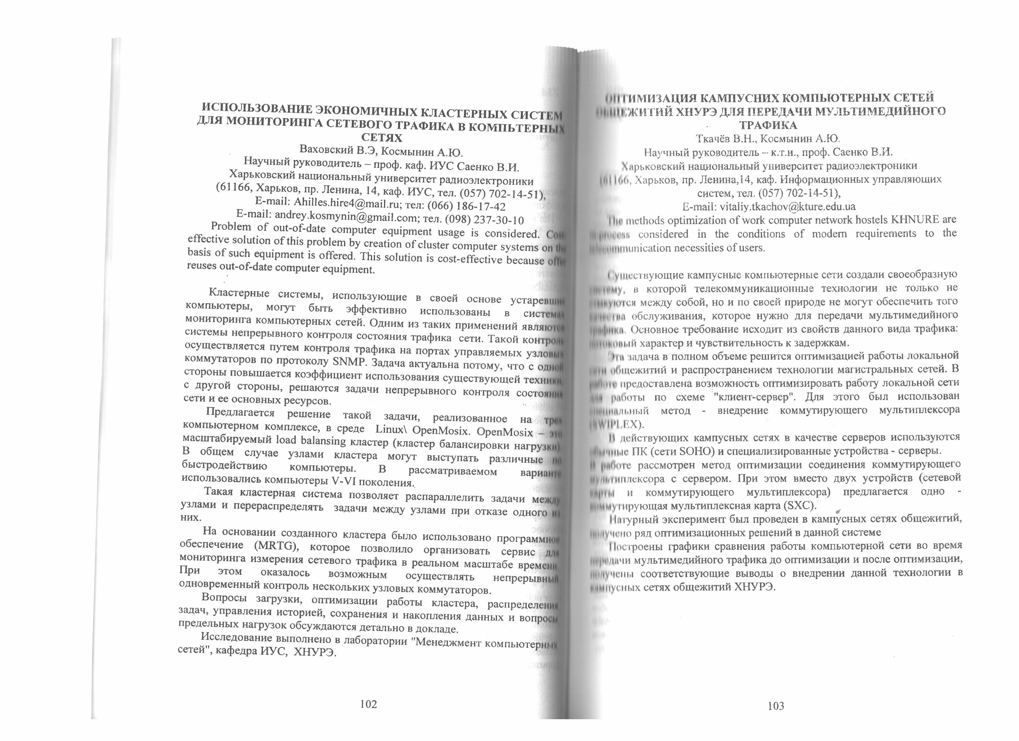 Ткачёв В.Н. Оптимизация кампусных компьютерных сетей общежитий ХНУРЭ для передачи мультимедийного трафика / Ткачёв В.Н., Космынин А.Ю. // 14-й Международный молодежный форум «Радиоэлектроника и молодежь в ХХІ веке», 18-20 марта 2010 г.: Сб. материалов форума. Ч.2. Конференция "Управляющие и интеллектуальные информационные системы и технологии" – Харьков: ХНУРЭ, 2010. – С.103.