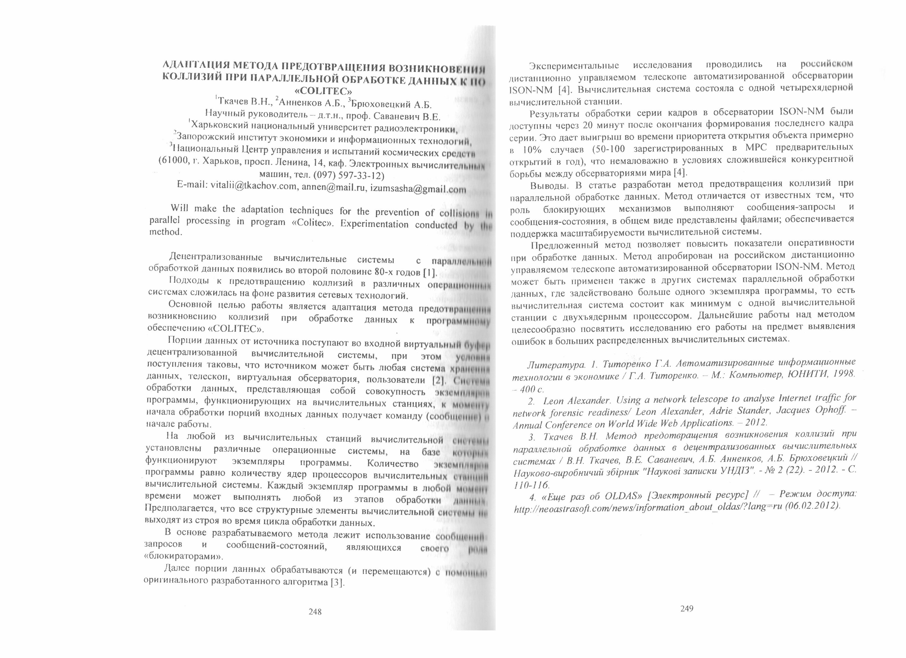 Ткачев В.Н. Адаптация метода предотвращения возникновения коллизий при параллельной обработке данных к по «COLITEC» / В.Н. Ткачев, А.Б. Анненков, А.Б Брюховецкий // 17 Международный молодежный форум "Радиоэлектроника и молодежь в ХХI веке". Сб. материалов форума. Т. 5. - Харьков: ХНУРЭ. - 2013. - С. 248-249.